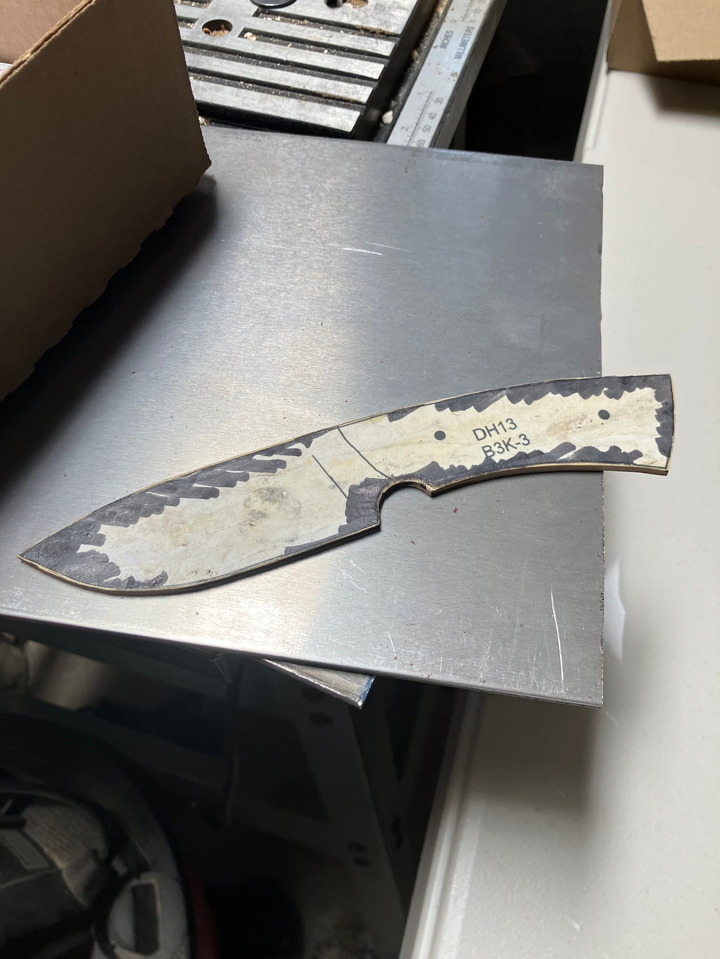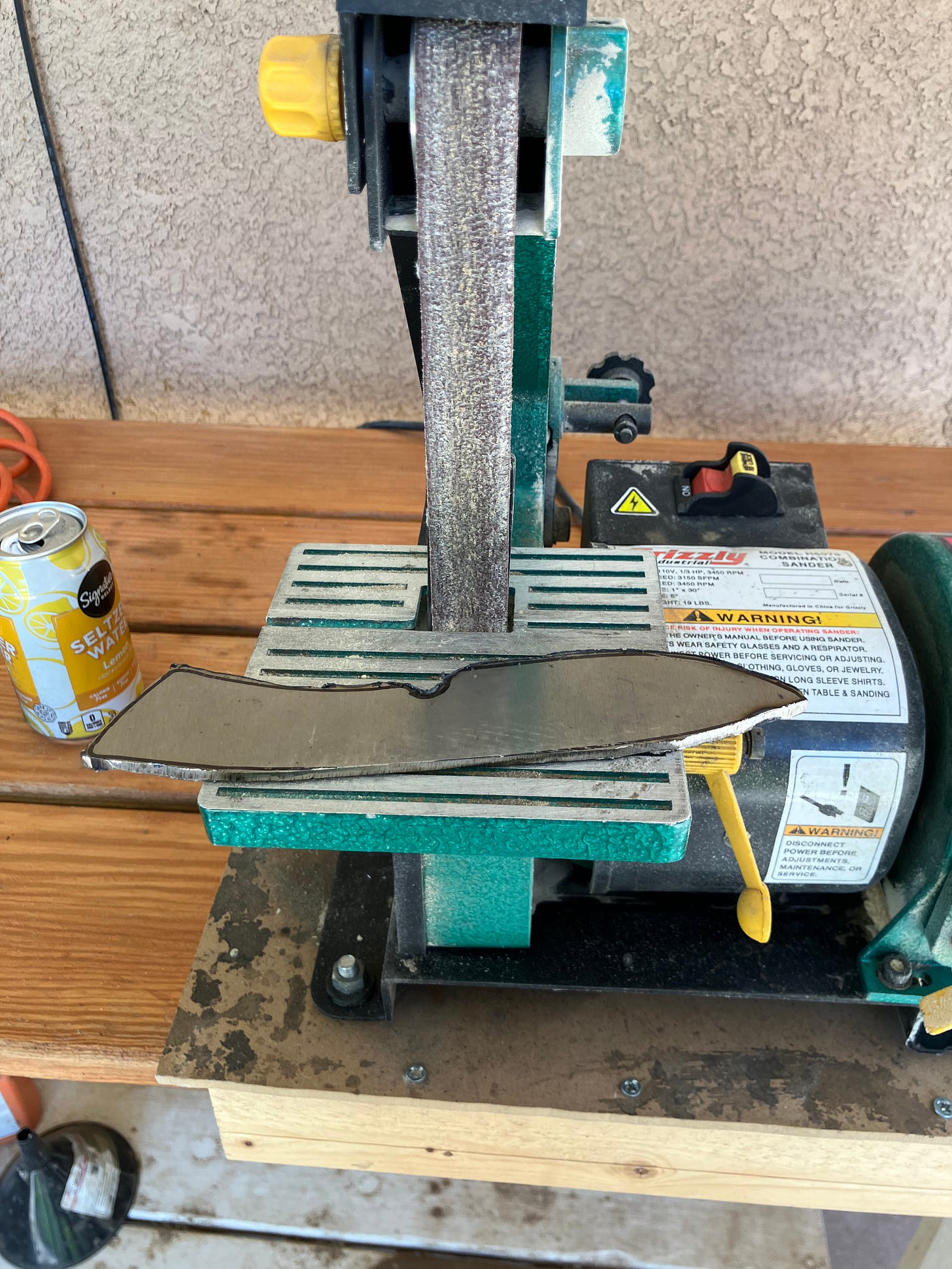 Now that I’ve got the rough shape, time to head to the belt grinder! I use a really coarse (60 or 80 grit) belt initially since I really want to grind down so as little of the black lines are showing. Here’s the blade when I start