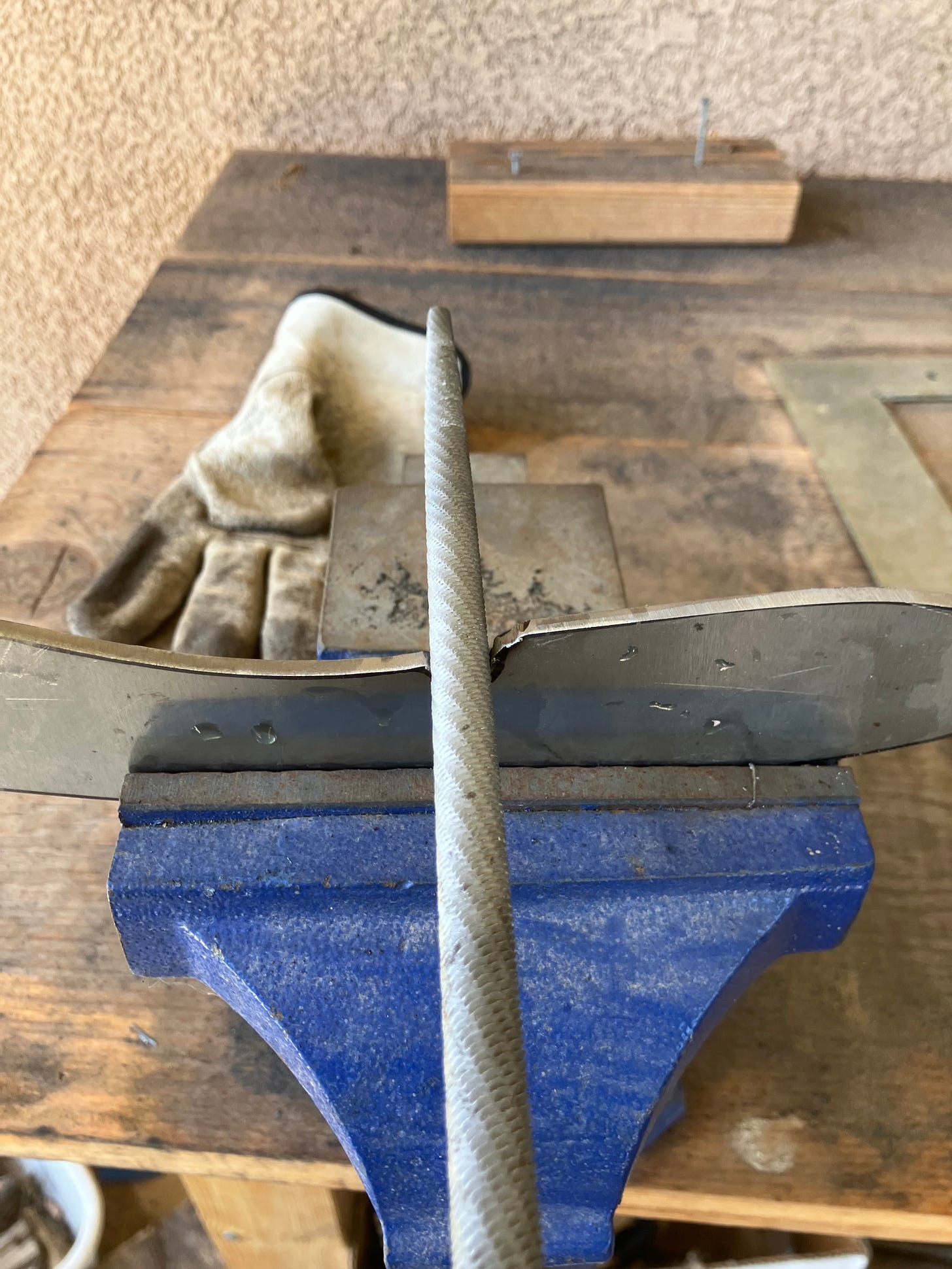 Basically the goal here is to have a final outline of the knife, smoothing out all the rough spots and making sure everything is ready to go before grinding the bevel. That little round part at the end of the blade (the finger notch) still needs some work, so I use a round file: